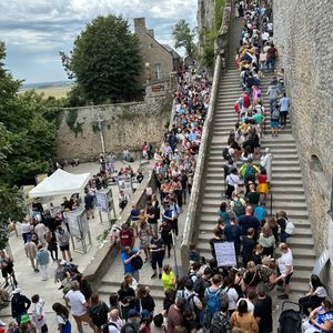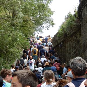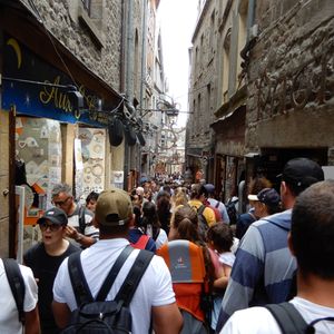 パリから400kmも離れているため、ツアーはとても助かりますが、平日にもかかわらず現地は激混みでした。ガイドさんは修道院までは同行せず、バスの中で「原宿の竹下通りのような混み具合だそうです」と説明されていましたが、「原宿の竹下通り」どころか「危険な混み具合」でした。結局、頂上の修道院にはたどり着くことはできず、内部見学は断念して帰ってきたので、とても残念な訪問となりました。地元の駐車場もいっぱいだったので、地元の人も多数訪れていたようです。8月のバカンスシーズンは平日といえどもこのような日があるようです。
