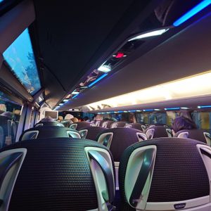 ・バスは2階建てで、自由席でした。一部リクライニング機能が壊れており、座席選びには少し苦労しました。参加者数に比して座席は多く、ゆったりとシートを使うことができました。座席前後の間隔は日本のバスと比べても明らかに狭めに感じたので、大柄な方だと窮屈かもしれません。また、荷棚がないので、大きい荷物は座席に置くことになると思います。