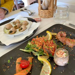 病気のため食事の量があまり取れない事を含め島内での食事を相談すると、ここは多い、少ない、ここはオムレツとガレット両方あります、今は閑散期に入りお店は半分程度しか開いてない、ここは閉まってます、等々