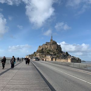 モンサンミッシェルに着いたら、全員でシャトルバスに乗り、橋の上まで一緒に行きます。橋の上で15分ほど自由時間をくれて、各々自由に写真を撮ったりできます。一緒のグループのアメリカ人の方がとても優しく、何枚も写真を撮ってくれました。橋の上での自由時間はそこまで長くないので、グループと離れてしまわないように気をつけました。