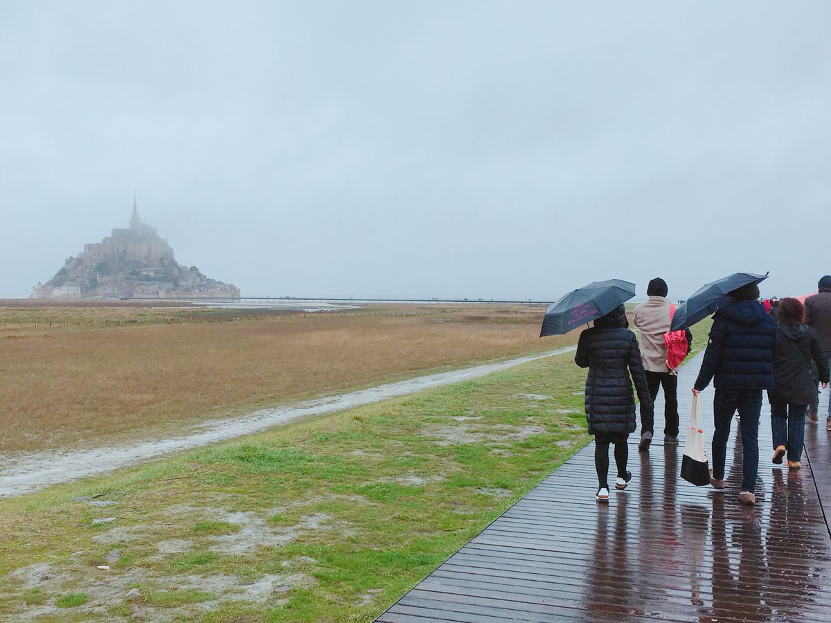 昼食後、デモの影響でナベットが来ず、雨も降ったり止んだりのコンディションで、ツアーの皆さんとル・モン・サン・ミシェルまで頑張って歩いたことは貴重な経験となりました。