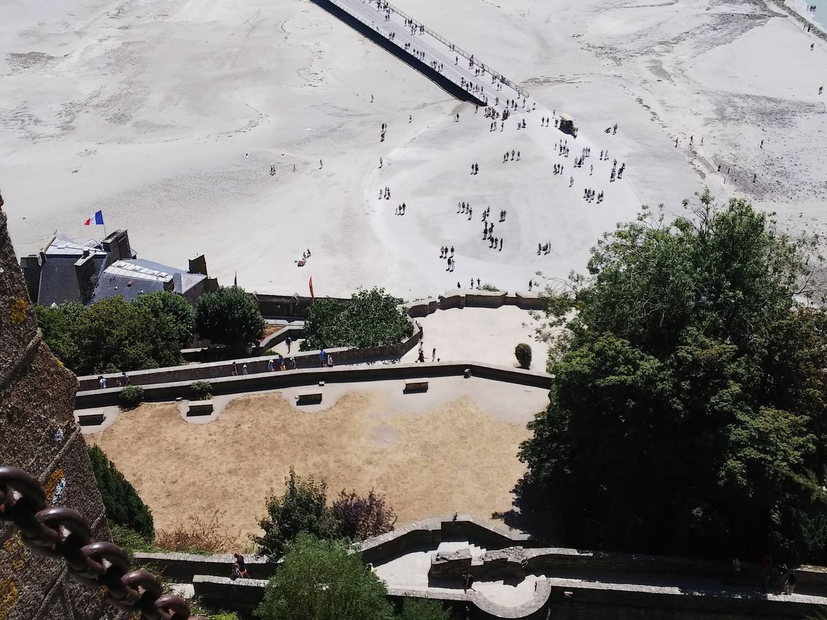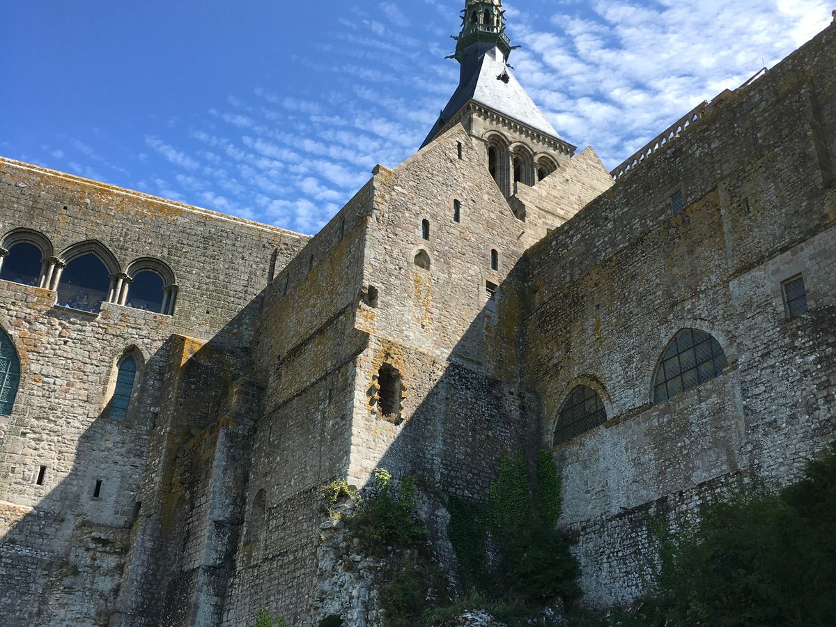 モンサンミッシェルはさすがに混んでいて、島に渡る無料シャトルバスも満員、教会に登る道も混雑していたので「猫の道」と呼ばれる階段で行きましたが、当日は30℃超えの猛暑で汗だくでした。