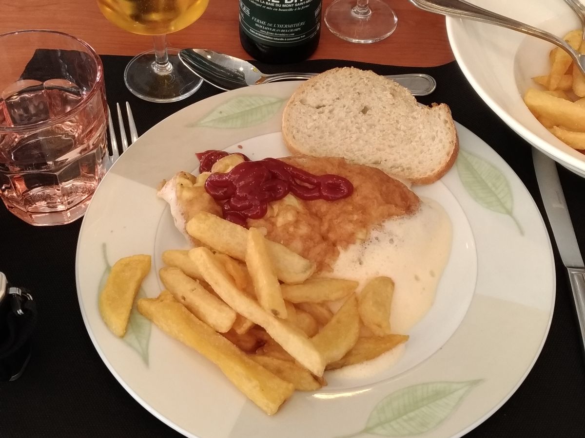 レストランは対岸のレストランで、実は事前に「そこそこおいしい」としてネットで調べていたレストランだったので良かったです。他のツアー客との相席、飲み物は別料金でした。近くに牧場があるためハエが多いですが、しょうがないですね。パンがテーブルに人数分用意されていませんでしたが、この辺は自分でウェイターに言うべきことなので。。オムレツは思ったよりおいしかったですが、フライパンのままテーブルに持ってきて、その場で雑に切り分けていきます。雑なため人により大きさがかなり違いました(笑)さすがです(笑)食べ終わった方から清算をしてモンサンミッシェルに向かうシステムだったので、気を使わずゆっくり食べられました。