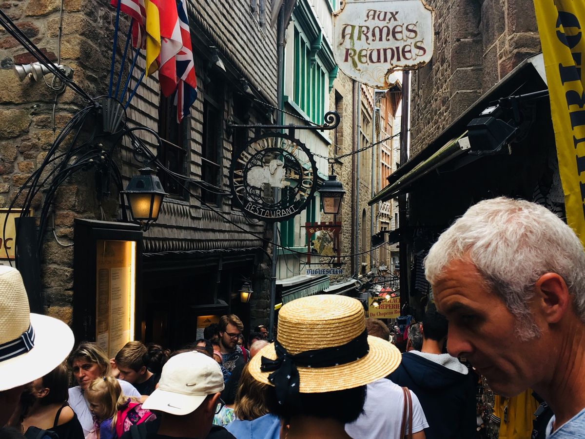 写真は途中で寄った村とモンサンミッシェルの修道院までのメインストリートの様子を。