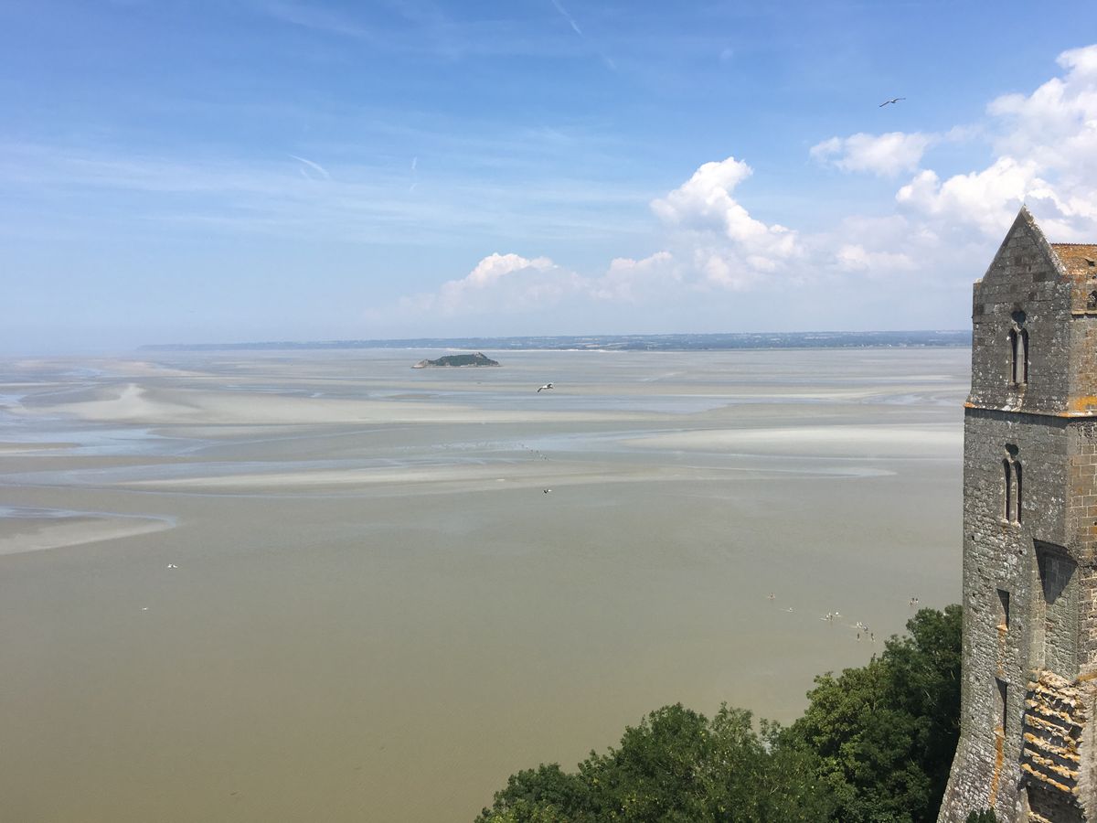 夏のモンサンは、干潮してて、グレー色の海が広がっていました。カモメ達が低空飛行で、飛んでいて元気良く鳴きまくってました。