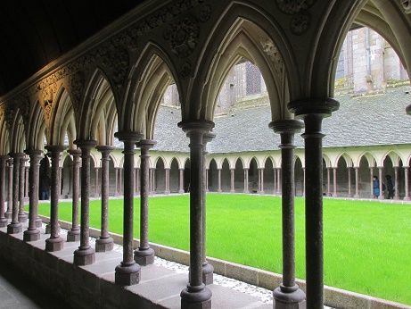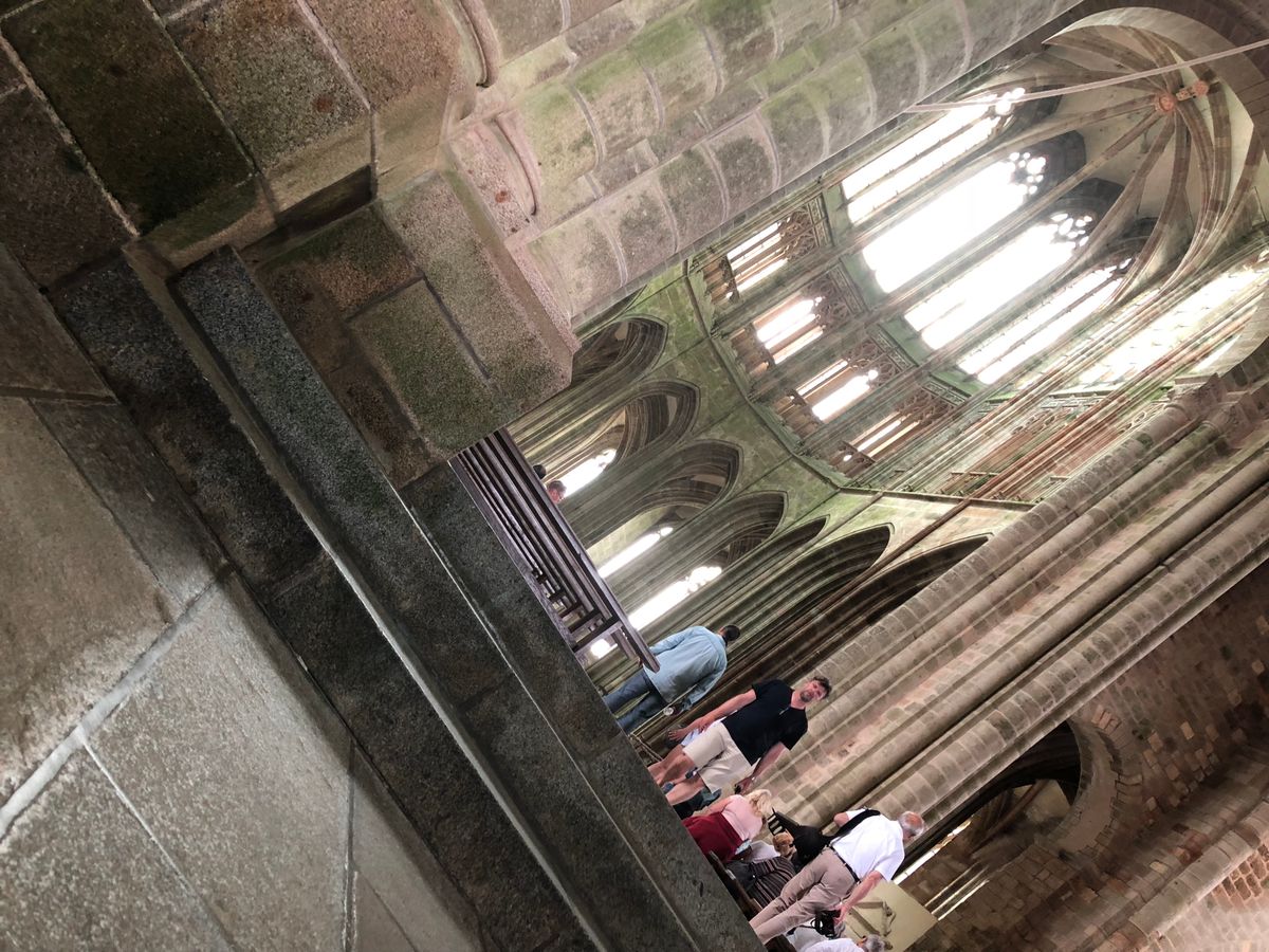 当初、モンサンミッシェルに着いてから自由行動のプランを選択したのですが、ガイドさんのバス道中の解説が素晴らしく、現地到着後のモンサンミッシェル見学のガイドも、追加でお願いしました。モンサンミッシェルは、岩の上に建った建物の特異な形態のみならず、そのロマネスク様式(11世紀)→前期ゴシック様式(13世紀)→後期ゴシック様式(15世紀)と建築様式の進化が凝縮されています。また、教会・修道院のみならず、要塞であったり、刑務所であったりと、いくつもの顔を合わせる持っています。それらの長い歴史が、100年戦争とジャンヌ・ダルクやランス大聖堂での戴冠式、フランス革命、ナポレオン時代との関わりを交えて解説いただきました。バス道中の街の解説も、モネら印象派画家との関わりとか、第二次世界大戦との関係とか、現在のパリ市民の価値観と行動とか、とても面白かったです。トイレ休憩で立ち寄った、セーヌ川河口のオンフルールの街も素敵です。船大工が建てた教会も一見の価値ありです。これら全部、ガイドさんの受け売りです。