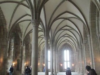 翌日午前は、予定通り修道院を見学しました。一泊組は午後の時間が退屈だと聞いていたので、ゆっくりと修道院を見学して、混みだした頃にホテルに戻り、午後一時半頃からまたモンサンミッシェルを眺めながら二時間以上かけて昼食をしました。いつまで見ていても飽きのこない素晴らしい風景です。時間があるので、食事しながらスケッチをしました。昼食代はツアーに含まれていないので、少々高めですが、結構美味しくいただきました。前日の昼食レストランよりはお勧めです。