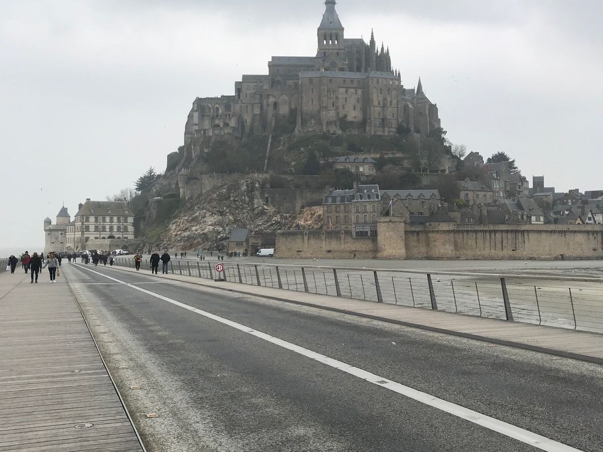 パリから350キロ、日本で言えば東京名古屋間位の距離があり、ツアーバスを選択して良かったと思います。朝7時集合でギリギリになりがち。日本人向けツアー会社が付近に2社あるので、集合場所を間違えないように。バスの中では案内を聞き、ウトウトしてる間に、窓からモンサンミッシェルの遠景が見え始め、車内では感嘆の声が上がりました。橋を渡りながら、モンサンミッシェルに近づいて行く時は、胸が高鳴り、曇りの日でしたが、それも良しと感じました。