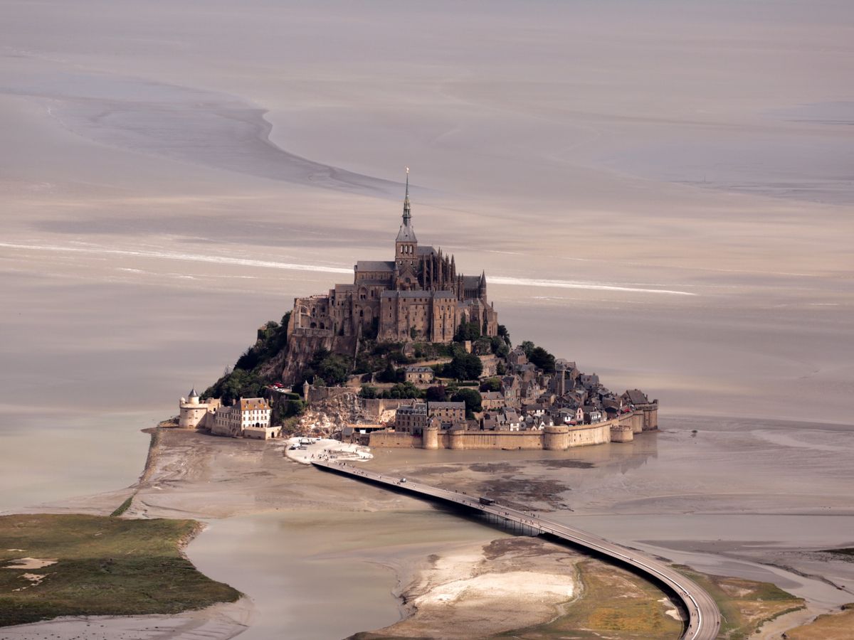 モンサンミッチェルを上空約300mで一周回って、陸上からは見ることが出来ない光景で、