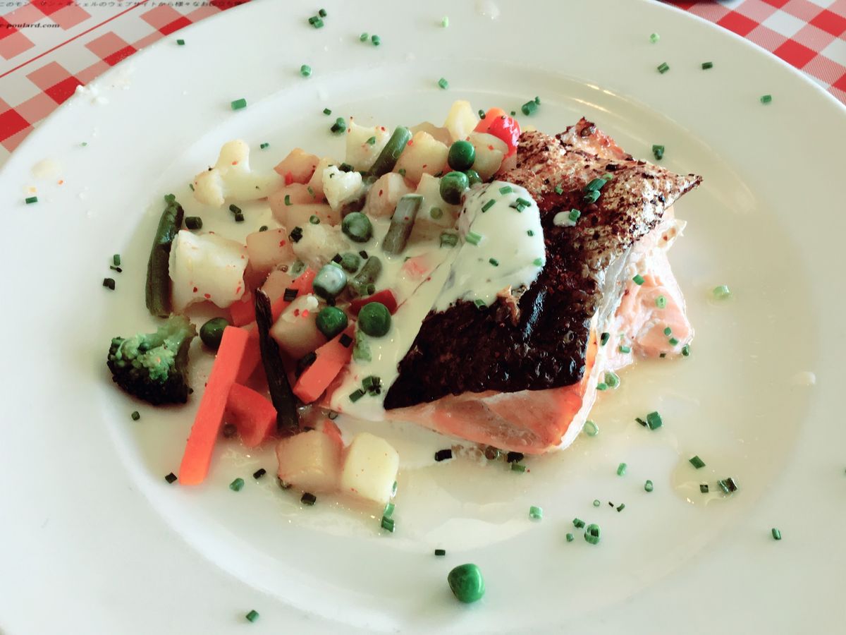 昼食はオムレツと魚料理、リンゴのタルトでした。