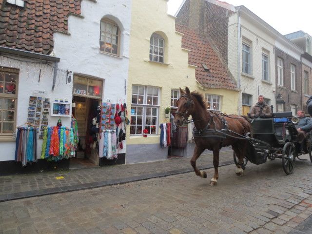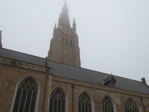 ブリュージュ訪問の日はあいにくの悪天候。冷たい雨の降る中での観光となり、ガイドさんはずぶ濡れの中での説明でした。自由時間も3時間ほどあったのですが、寒さの中で飛び込んだレストランで暖かいスープとたっぷりの食事をして、ようやく生き返った思いでした。もっと時間がほしいというのが正直な感想で、鐘楼に登りたいと思っても並んで待たなければならず、時間がないので、結局はざっと見て回って、お土産を買い、ワッフルを食べて、・・・という観光になりました。それでも、運河に囲まれたレンガ造りの街並みは中世に飛びこんでしまったかのようで、もっと晴れた日にもう一度来たいと強く思った次第です。