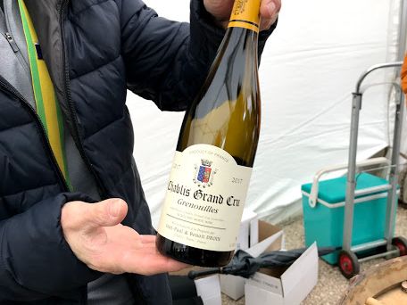 シャブリのワイン祭りでは、ガイドさんからワイングラスを受け取り、各自回ってグラスにワインを注いでもらう方式です。試飲には追加料金はかかりません。
