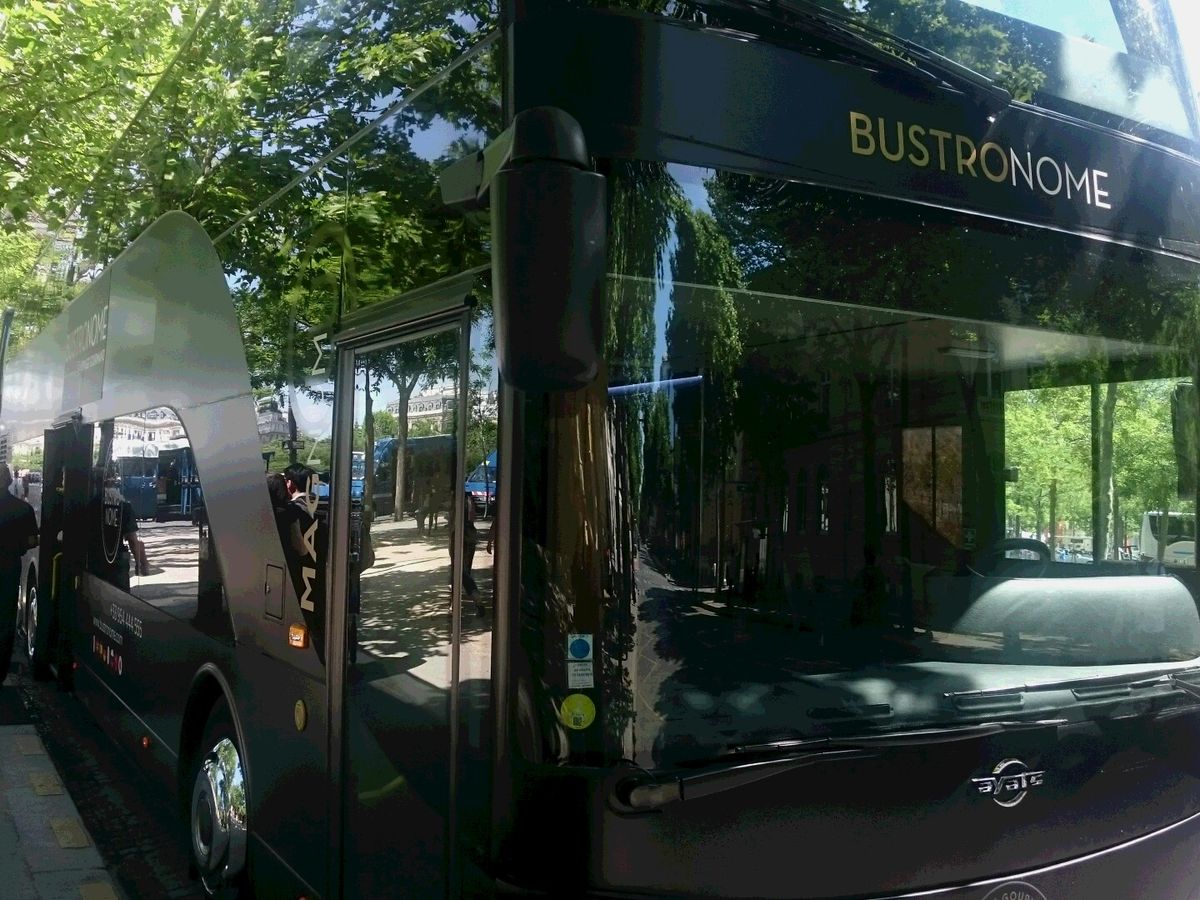 あるテレビでこれを見て、パリで必ず乗ってみたいと思い申し込みました。乗り場が凱旋門の横あたりなので、凱旋門に登り時間調整をしました。時間少し前につくと3台のバスが待機していました。乗り込みペンで観光案内が流れる日本語の説明があり(ゼスチャーでしてくれるのですぐわかります)、シャンパンを注がれバスが出発しました。料理もおいしく、サーブしてくれる人も愛想がよく白赤ワインも並々注がれるし楽しい時間を過ごせました。私たちの後ろにイタリア人?の団体がいて明るくて一緒に楽しんでしまいました。とてもとても眺めがよく楽しく美味しいレストランバスでしたよ。主人の退職のお祝い旅行の一つの思い出となりました。(ロンドンでもこのバスを見ましたよ)