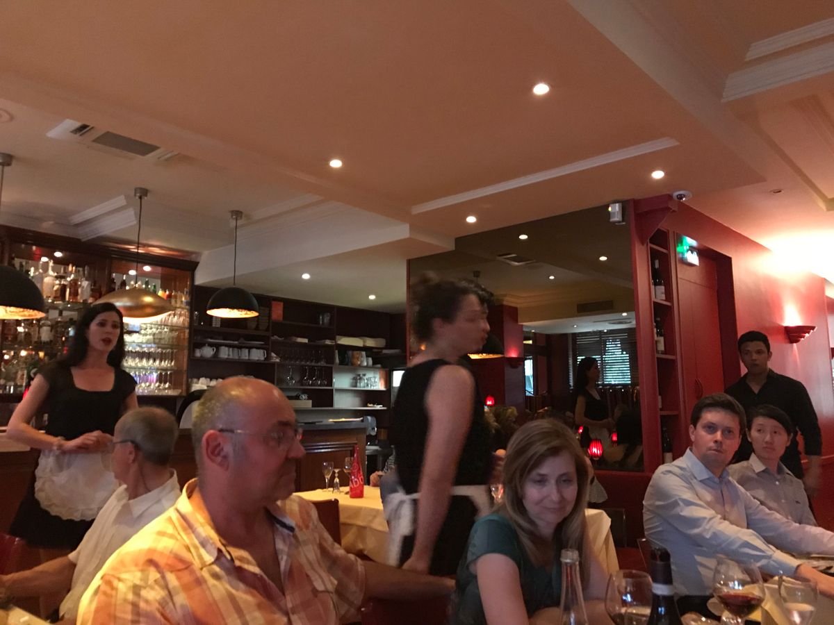 ソプラノ、メゾソプラノ、アルト、テノール(たぶん)の4人が給仕サービスの合間のショータイムでピアノに合わせてオペラの名シーンの曲を店内に響かせて歌います。お料理も雰囲気も良くてコスパ最高のツアーだと思います。20:30で予約して行くとほぼ満席でした。オペラ椿姫の「乾杯の歌」では、お客も皆でグラスを片手にラララと大合唱で盛り上がりました。日本人も数組いましたが大体は外国人でした。給仕はフランス語と英語、ベルカントはイタリア語、日本語なしでも音楽と美味しいもので楽しい時間を過ごせました。渋々付いてきた娘と夫も大満足しておりました!パリに行く機会があったらまた出掛けたいお店です。