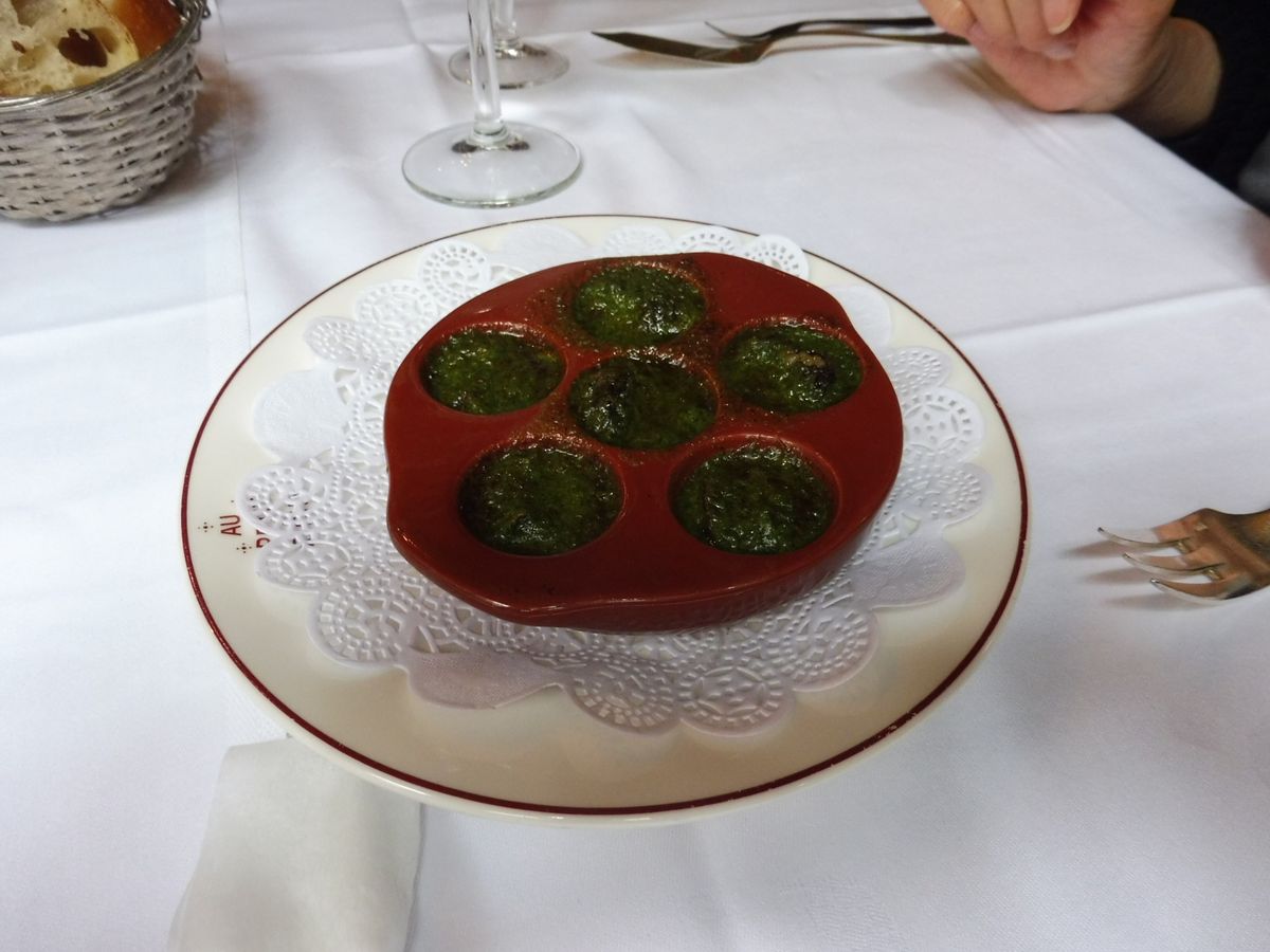 食前酒のシャンパンから始まります。前菜はエスカルゴとウサギ料理を注文しました。エスカルゴは殻つきだと思っていましたが、殻から取り出された状態で出てきたため、少し期待はずれでした。またエスカルゴはニンニクバター風味とのことでしたが、少し口に合いませんでした。