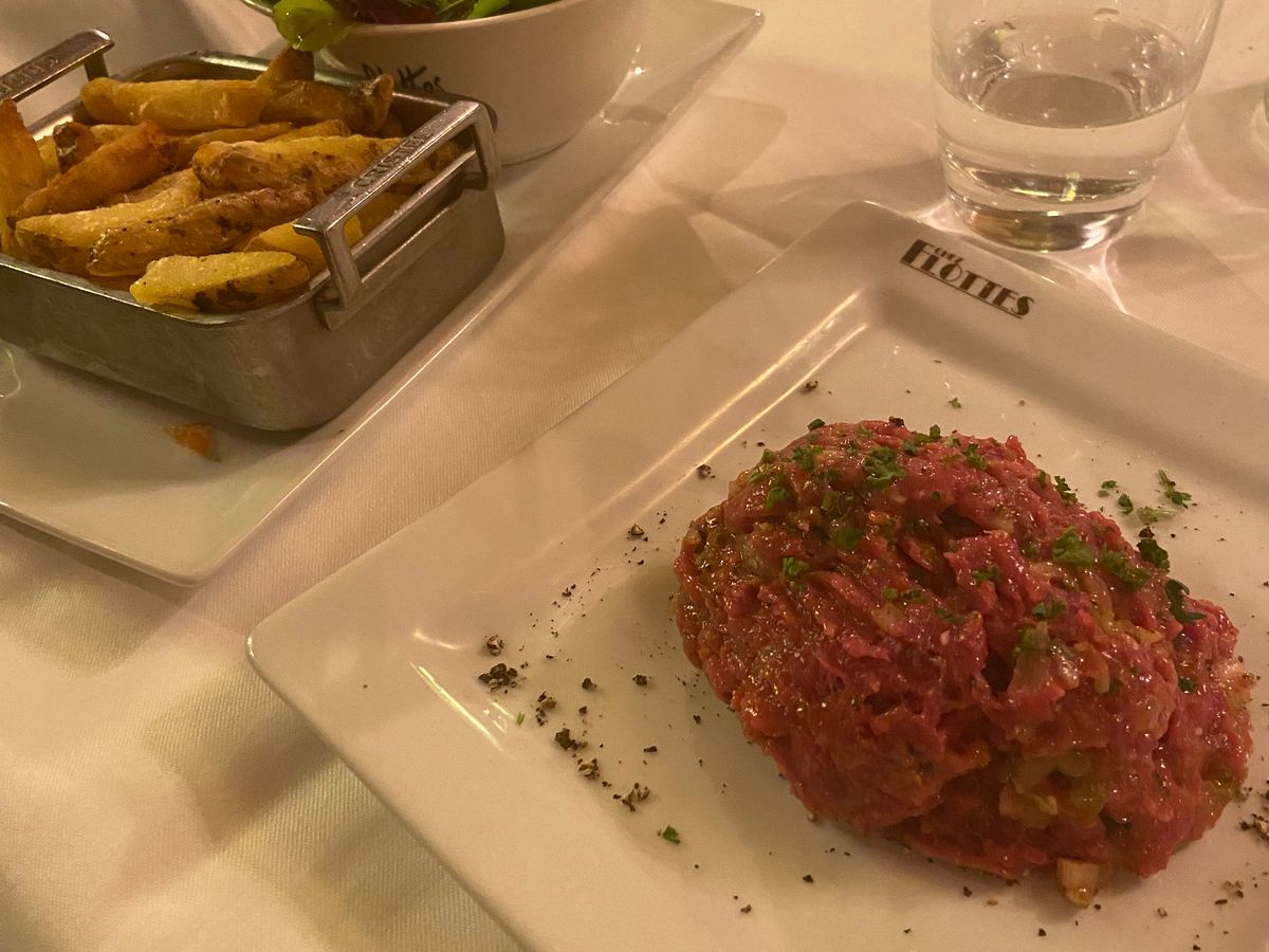 私は悩んだ結果、今は日本では滅多に食べられない生肉に!タルタルステーキはなめらかな口当たりで、とっても美味しかったです。日本でも食べられたらいいのに、、、。残してしまいましたが、スタッフさんは親切で「君には多すぎたかい?」とにこにこと聞きながらお皿をさげてくださいました。