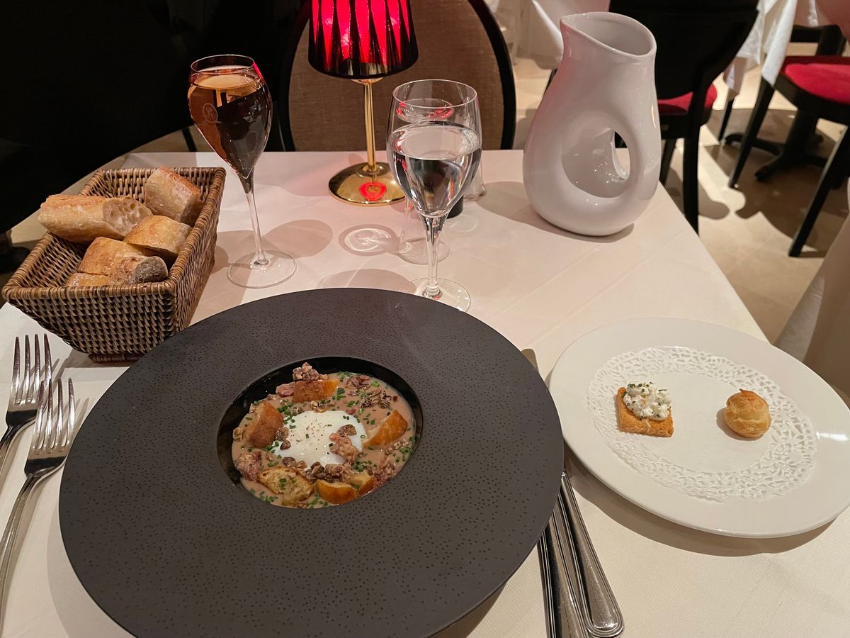 予約時間13時前に受付に到着がエレベーターに乗り店前までかなり時間かかります。店に入るまで30分並びます。値段により案内される席が違います。QRコードでメニューを読み込み日本語を選択してオーダーしました。ワイン2杯目はリクエストしていただきました。デザートのケーキは残念ながらルノートルのではなく単にチョコムースのメレンゲかけで残念でした。トイレは入り口の右にあります。お店の中は綺麗に飾られ、スタッフも親切です。全て英語でフランス語でなくて大丈夫です。