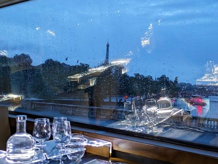 エッフェル塔を見学し凱旋門に移動しようとしたときに突然の雨、傘をホテルに置いて来ていたのでかなり濡れてしまった。6時半頃 指定の場所近くに1台目のバスが到着したので確認したところ乗るバスは2台目のバスで少し遅れるとの話だったが、傘もなく雨に濡れている姿を見てバスの中に入るように勧めてくれた。開店準備の邪魔になりながら雨宿り、おかげで盛り付けの準備などが見学できてよかった。7時半 ようやく出発 まだ明るいなか ウエルカムシャンパンが最初に出て、計6品 いずれも適量でなじめる味 料理に合わせてそれぞれのプレート、陽が暮れていく街中をバスはゆっくり回り エッフェルとの照明の瞬きの時間では降車して写真を撮れるなど楽しめる内容だった。同乗者で誕生日の方がいて、デザートにキャンドルが添えられてHappyBirthDayの合唱 とても和やかな雰囲気だった。 エンタテイメントとしてはなかなか楽しめるもので期待以上であった。余談ですがMetroの紙のチケット 雨で濡れていたためか自動改札口で出てこなかった。ナビゴイジーはプラがお勧めです