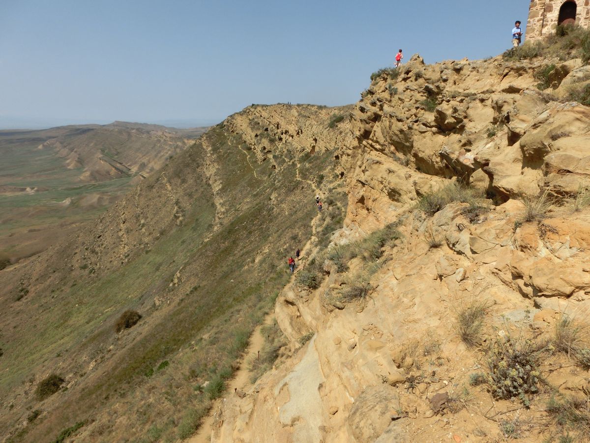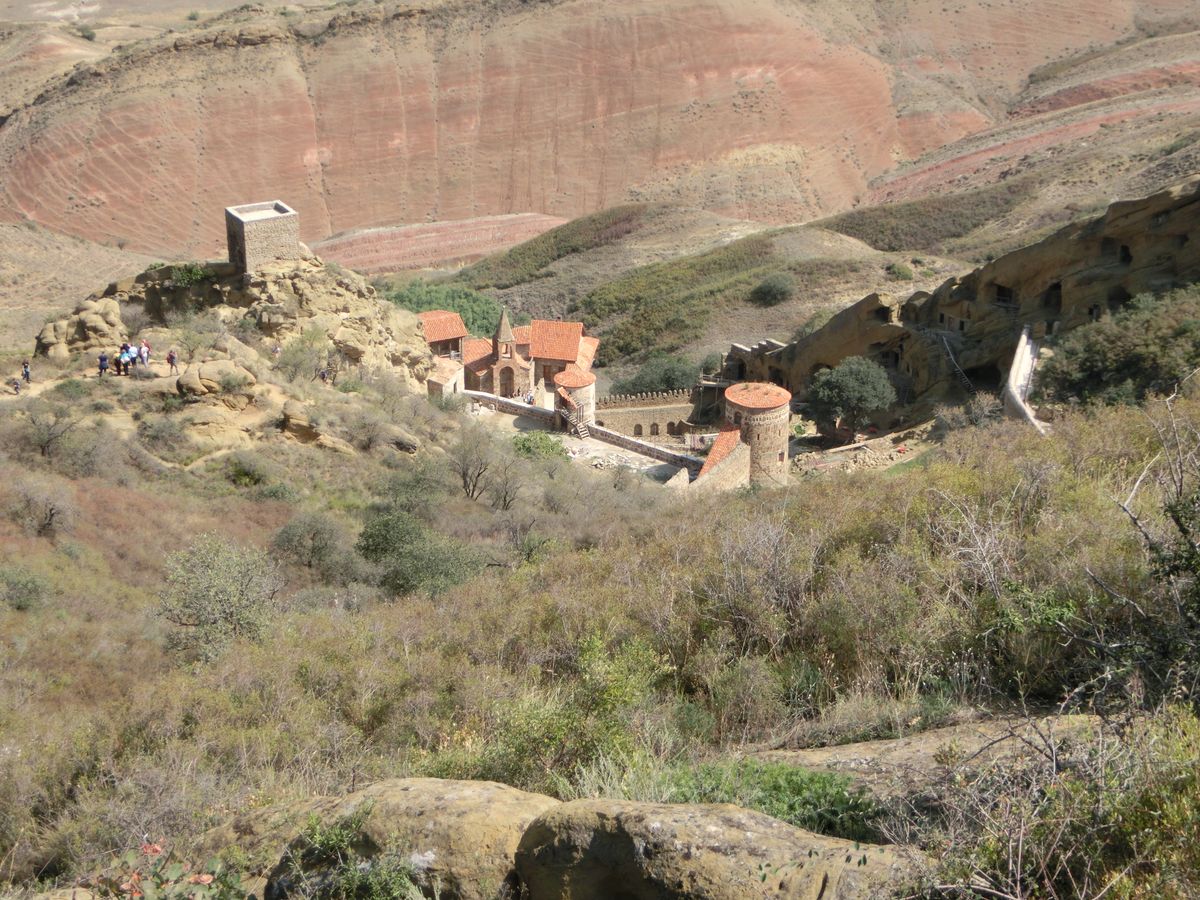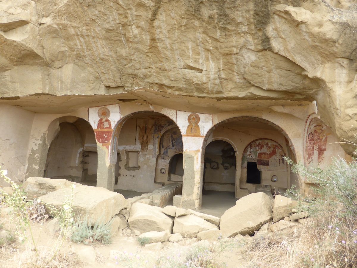 トビリシから車で約2時間半。後10kmの地点までは1時間半なのですが、残り10分の道が非常に悪いため40分以上かかりました。駐車場についてまずラヴラ修道院を見学。ここにいたるまででも結構きつい坂を登ります。この複合修道院は6世紀に設立されラヴラは多分13世紀頃にできた複合施設の中でも新しいほうです。かなりの部分が修復中でしたが、現役の修道院としての厳粛さを感じさせます。ここから急な山道を越えてウダヴノ洞窟修道院へ2時間超のトレッキングに入ります。この登山はかなりきついですので、足腰に自信がない方はやめた方がいいかもしれません。ツアー案内には「ウィーキングツアー」とありますが、そんな甘いものではありません。ちゃんとはきなれた靴をはいて十分に水の準備をして登ることをお勧めします。ただ登りきるとアゼルバイジャン国境方面の雄大な景色ときれいな色彩が一部残った洞窟修道院というご褒美が待っています。ちなみに下り坂もかなりきついです。現在でも人里離れてバスも入ってこれないような場所に、しかも6世紀のような昔に修道院を建てて(洞窟を掘って)修行しようとしたなあと宗教の力に感動します。車の移動や山登りはけして楽ではありませんが、苦労して見に行く価値のある場所です。