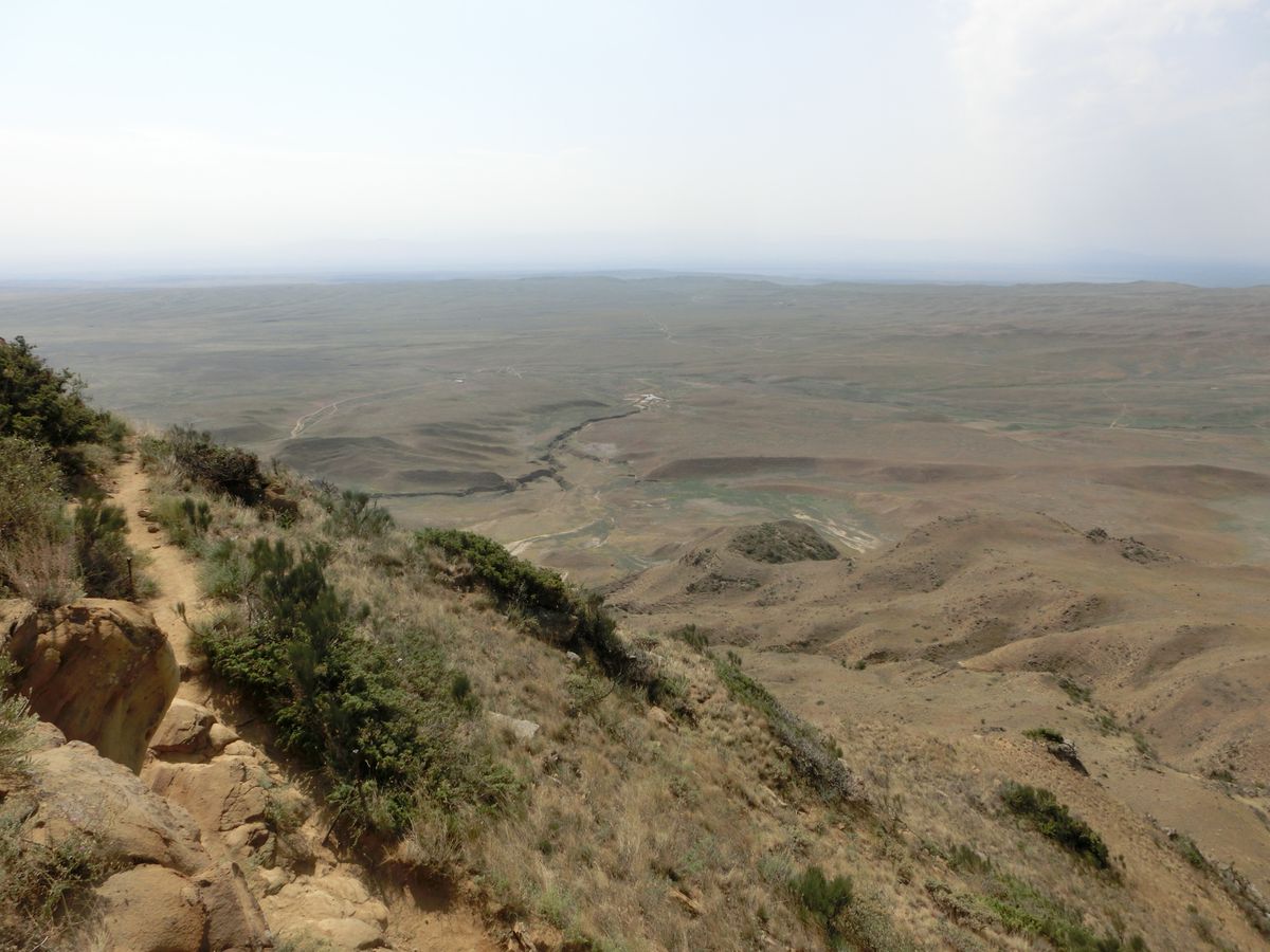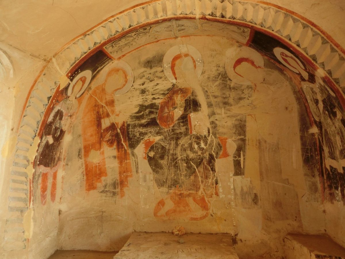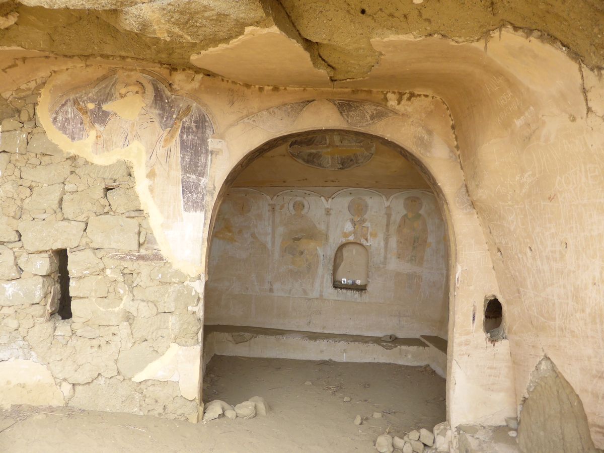 トビリシから車で約2時間半。後10kmの地点までは1時間半なのですが、残り10分の道が非常に悪いため40分以上かかりました。駐車場についてまずラヴラ修道院を見学。ここにいたるまででも結構きつい坂を登ります。この複合修道院は6世紀に設立されラヴラは多分13世紀頃にできた複合施設の中でも新しいほうです。かなりの部分が修復中でしたが、現役の修道院としての厳粛さを感じさせます。ここから急な山道を越えてウダヴノ洞窟修道院へ2時間超のトレッキングに入ります。この登山はかなりきついですので、足腰に自信がない方はやめた方がいいかもしれません。ツアー案内には「ウィーキングツアー」とありますが、そんな甘いものではありません。ちゃんとはきなれた靴をはいて十分に水の準備をして登ることをお勧めします。ただ登りきるとアゼルバイジャン国境方面の雄大な景色ときれいな色彩が一部残った洞窟修道院というご褒美が待っています。ちなみに下り坂もかなりきついです。現在でも人里離れてバスも入ってこれないような場所に、しかも6世紀のような昔に修道院を建てて(洞窟を掘って)修行しようとしたなあと宗教の力に感動します。車の移動や山登りはけして楽ではありませんが、苦労して見に行く価値のある場所です。