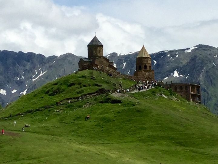 スキー場のほうに向かうとき、どんどん周りの景色が白くなっていって、ジョージアとロシアの友好の印として建てられたという展望台のところは、ほんとに霧で真っ白で、そこだけ残念でしたがこんな景色だったのもいい思い出です。日本語ガイドさん付いてると、歴史とか、詳しく説明が聞けるので安心ですね。ランチも美味しくて鮮やかな赤いボルシチ、茹でたてのヒンカリ、ハチャプリなどお腹いっぱい食べて、昼からの山登りの元気をチャージ。私達はふだん、運動の習慣がないので、かなりハードでした。鍛えているというガイドさんは息一つ上がらない!すごい。このときには天気も味方してくれて、暑くも寒くもなく。ときどき休憩をはさんでもらいながら、どうにか教会までたどり着きました。山に囲まれたところにポツンと教会が、すばらしい景色です。頑張って登った甲斐がありました。下りは早かったです。