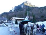 朝から雪が少し降っていたのですが、たくさんの人が歩いているため道路も凍結しておらず歩きやすかったです。ノイシュバンシュタイン城まで30分ほど緩やかな上り坂を歩きます。馬車はとても混んでいたので乗れないと思います。お昼はノイシュバンシュタイン城の見学が終わった後にある城内のカフェか、周りにホットドッグのようなものを食べられるお店がいくつかあるので、バスに戻る道中に食べることができます。バスの中でも飲食が可能で、朝に集合場所付近で買ったサンドウィッチを食べることができました。ソースやコーヒーなど溢さないように十分に注意する必要があります。