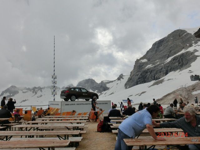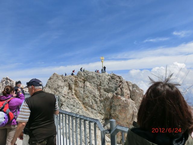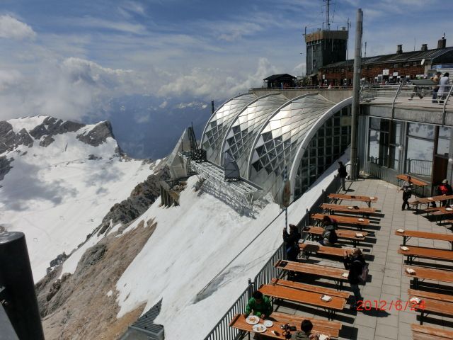 ドイツ最高峰の山です。バスとケーブルカーで何の苦労もなく頂上までいけます。以前、日本で2,000mの山にふもとから登った時は5,6時間かかったので、それがわずか10分で2,000mもケーブルカーで上がってしまうので、便利は便利ですが、10分で上に登ることの感動を味わえません。頂上から見る景色はすばらしく、またビールや食事もとれますが、そう高くはないし、味もまあまあです。