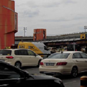 空港でバックを受け取り税関申告を出て、右側のバス乗り場約50mへ向かいます。