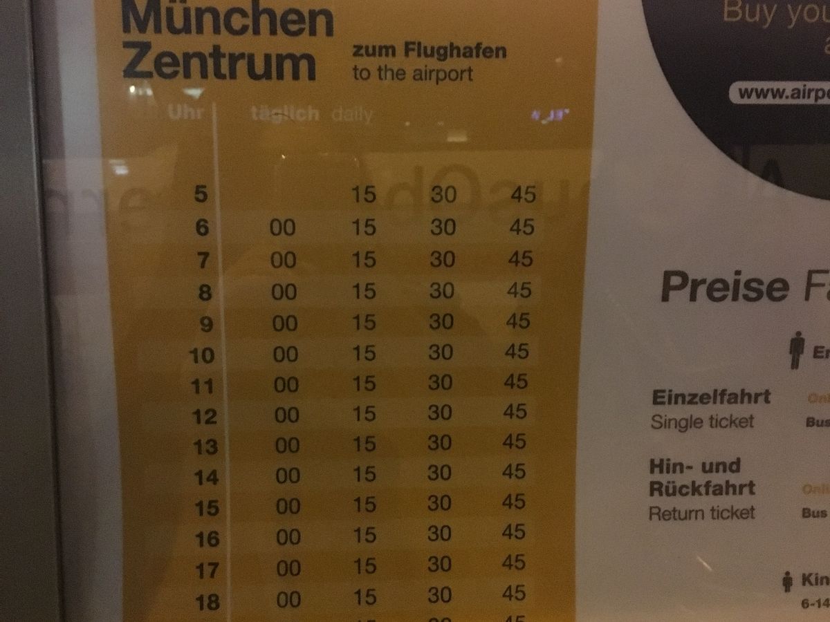 15分おきに出発する便利なバスでした。ドライバーさんに、プリントアウトしたバウチャーを渡すだけで、トラブルもなく、スムーズに発券していただけました。ミュンヘン市街から空港まで、1時間程度で到着します。観光で疲れた後も楽に移動できるし、チェックインカウンターの目の前に停車するので便利です。ありがとうございました。