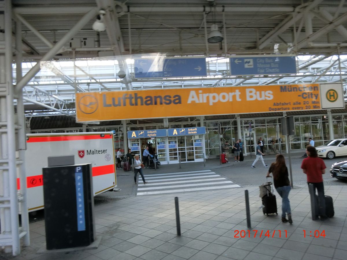 初めて行く空港に夕方到着の一人旅だったのですが、リムジンバスを日本から予約しておいたので、不安もなくよかったです。バスの乗り場は一応チェックしてあったのですが、スーツケースをピックアップしてから、BUSと書いてあるサインを頼りに外に出たら、他の方が載せてくれていた写真の乗り場とは違う場所(裏側?)に出てしまいました。が、そこにもシャトルのバス乗り場はあって、黄色いルフトハンザの目印があってわかりやすかったです。バスは15分おきに出ており、そのときも5分ほど待ったらすぐに来ました。