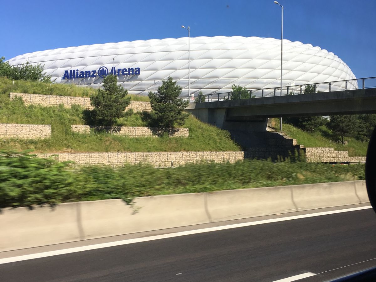 バスの中では右側に座れば、バイエルンミュンヘンのホーム、アリアンツアレーナを