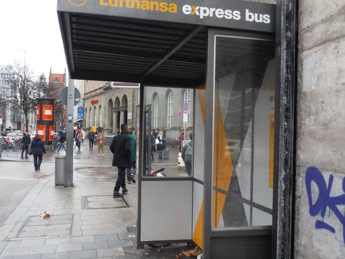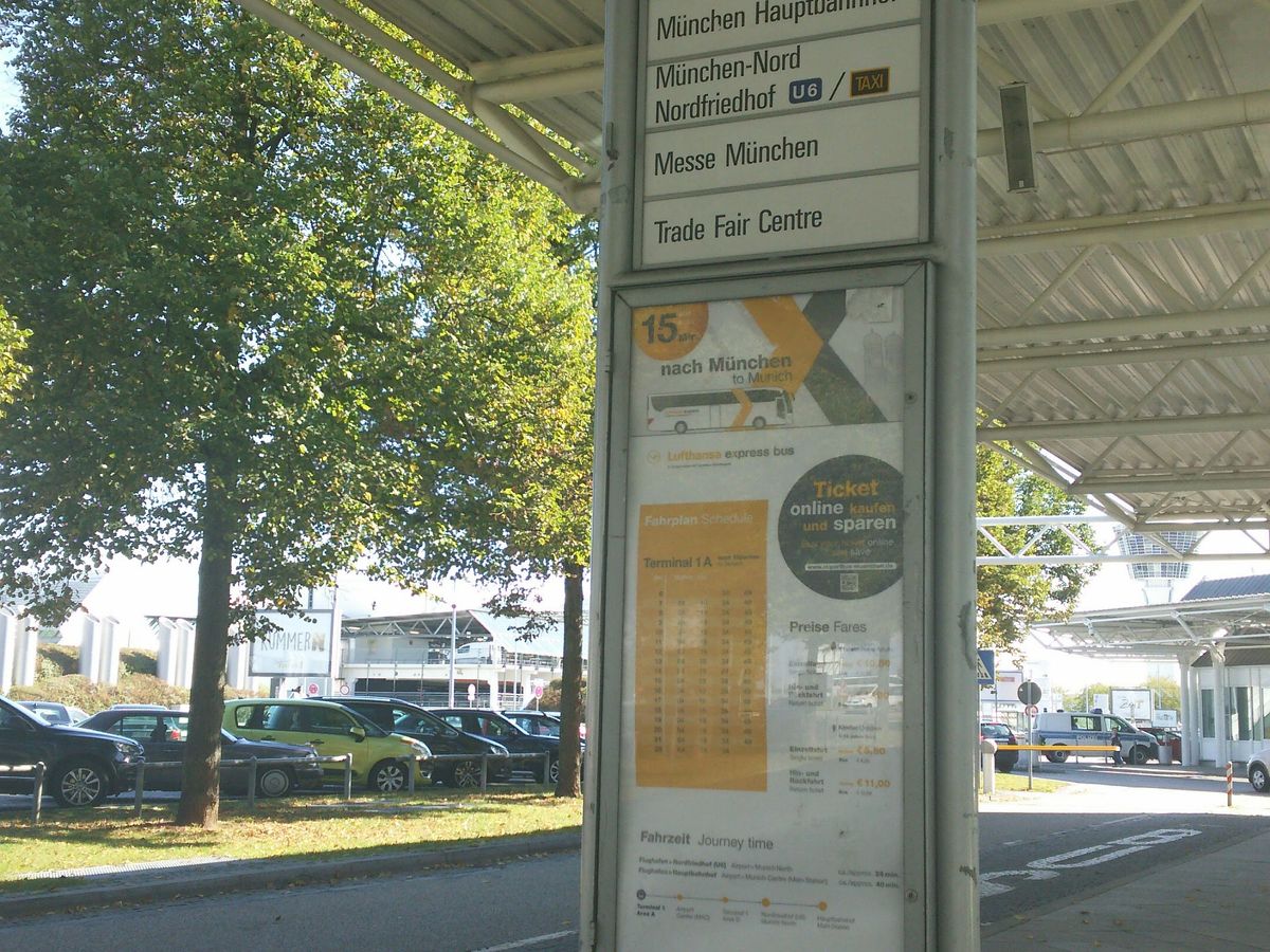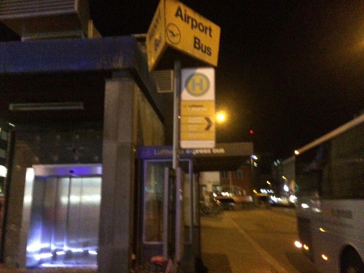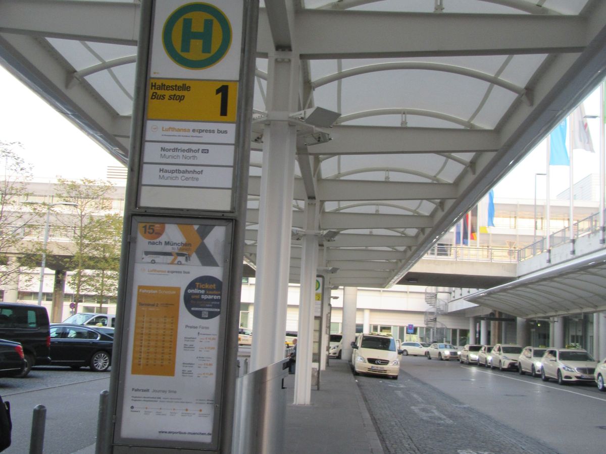 ホテルがミュンヘン中央駅から徒歩圏内だった事もあり、一番楽で簡単に行ける方法と言う事でエアポートバスを選びました。ミュンヘン国際空港のバス乗り場は到着ロビーを出て右に曲がりまっすぐ歩いて外に出ます。外に出てすぐの1番乗り場がエアポートバス乗り場です。バスの看板も出ているので迷うことはありません。