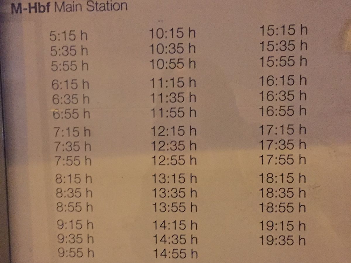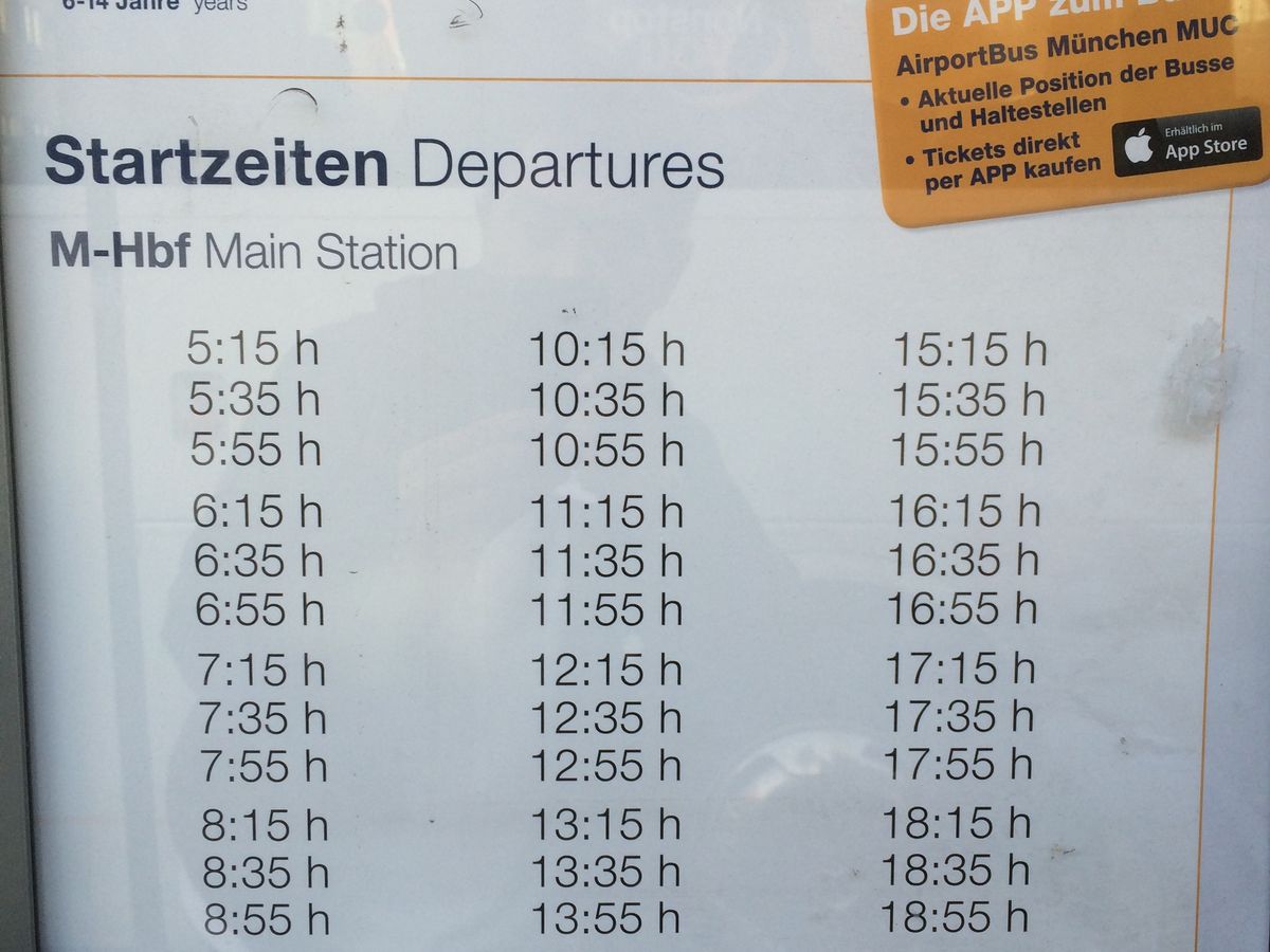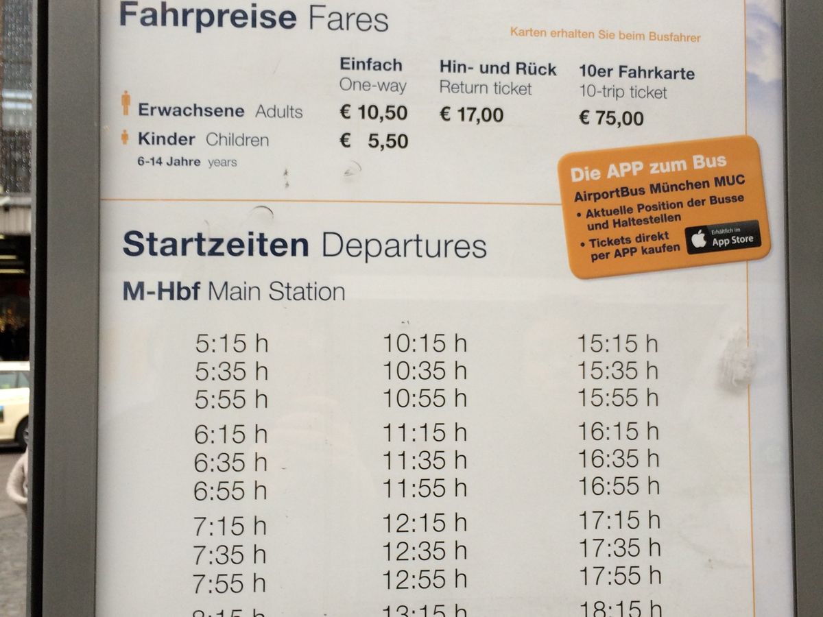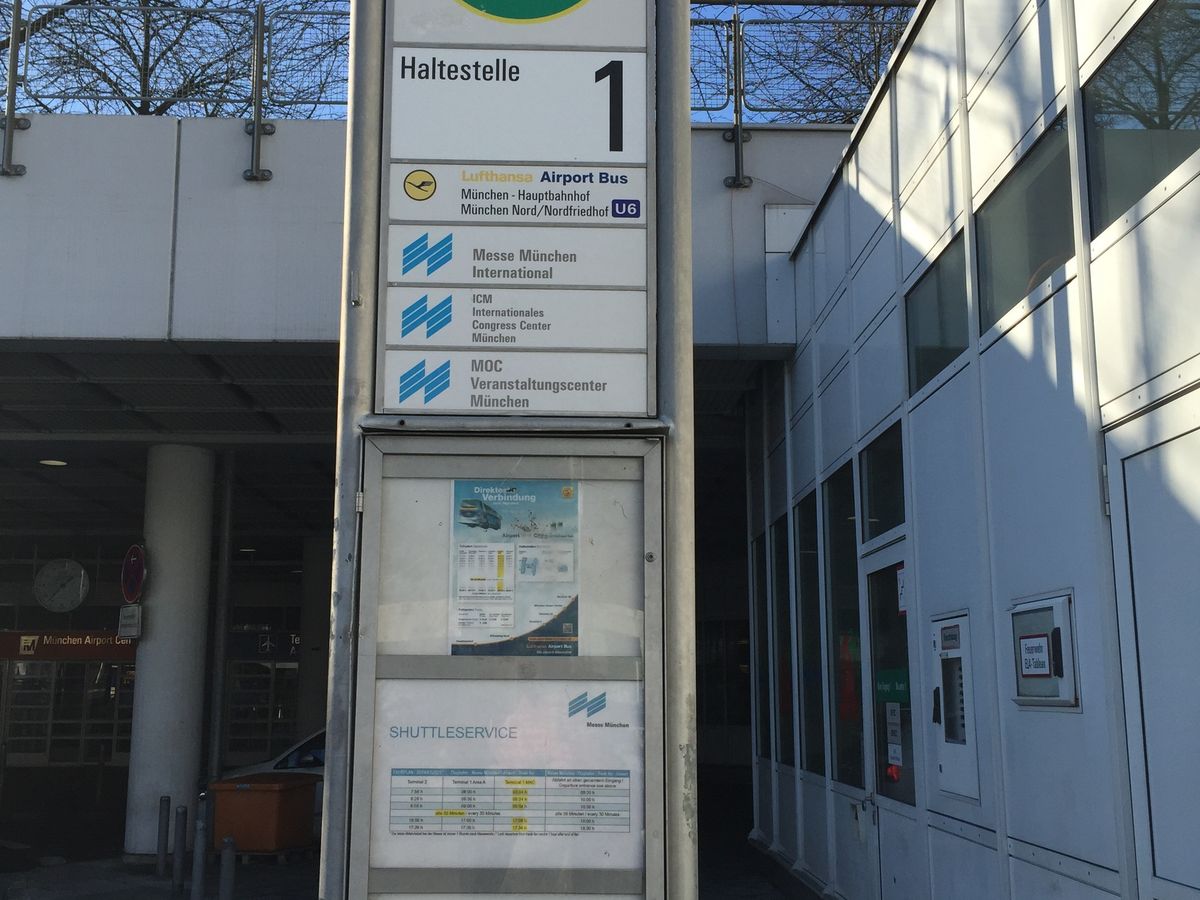 2015年秋に利用。ミュンヘン空港の第2ターミナル到着ゲートを出て右、サービスセンター前の通りを直進、自動扉を出て、すぐの道を渡ったところに乗り場がありました。小一時間でミュンヘン中央駅に到着。降車、乗車が同じ場所なので、帰りも迷わず乗車できます。時刻表も貼ってあります。