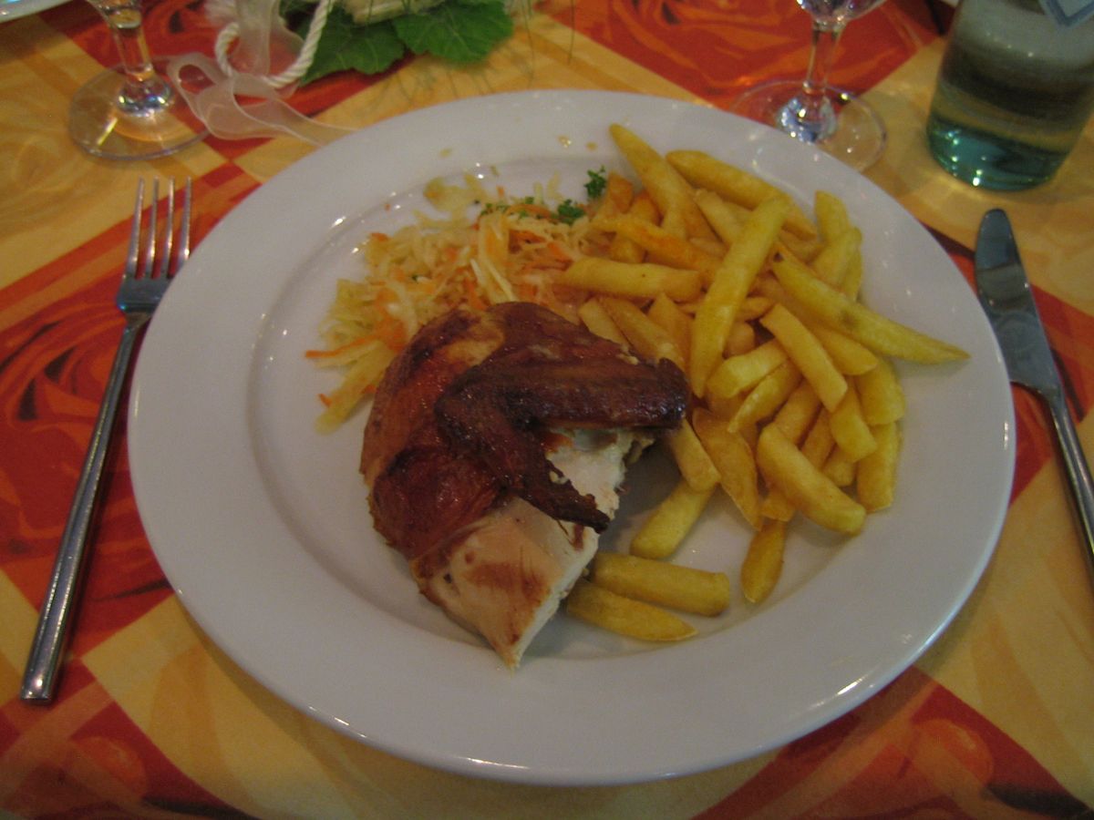 船に乗る前にレストランで昼食ですが、チキンかベジタリアンか聞いてきます。チキンは日本人には十分なボリュームがありました。ベジタリアンはフライドポテトの他にもう一品野菜が付いていました。