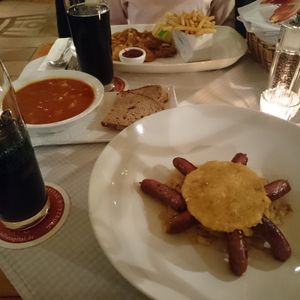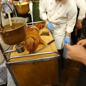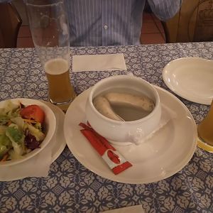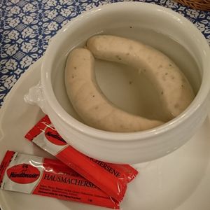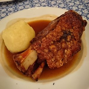 2人で申し込んだので異なる料理をオーダー。前菜は白ソーセージ2本とポテトスープ、メインはシュニッツェルとシュバイネハクセン。とくにシュバイネハクセンはボリュームだけでなくソースが絶品でした。添えられていたポテト団子の食べ方は隣にいたドイツ人グループを見よう見まねで。こうやって食べるのかあ、といった感じで楽しく頂きました。デザートのスィーツは、甘いものが苦手なので残してしまいました。できればスィーツではなく、もう一杯白ビールが選べれば言うことなしでした。