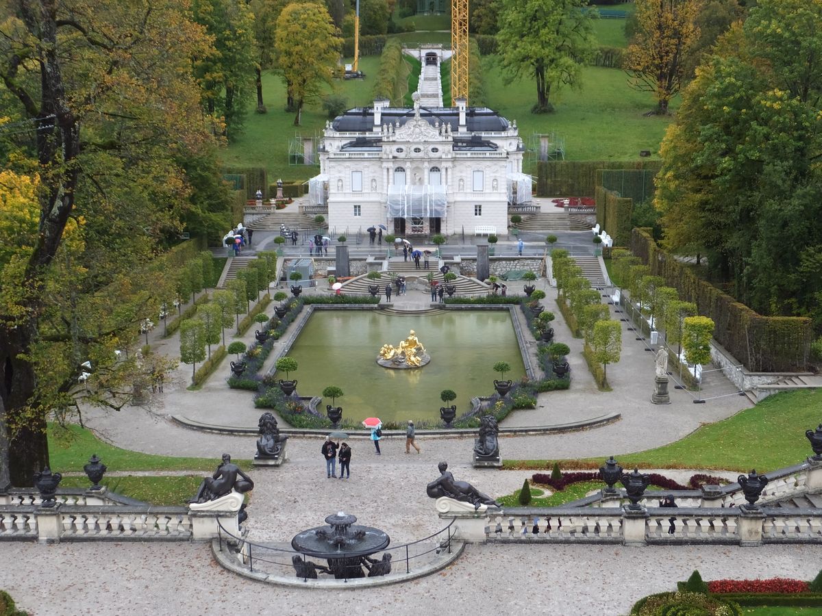 リンダーホーフ城では天気が回復。こちらも時間制入場で音声ガイドに従って進む形式。ノイシュバンシュタイン城も豪華だったが、リンダーホーフ城も豪華で、パステル調の部屋もあり可愛らしかった。観光客が少ないためか、こちらの方が落ち着いて見学できた。
