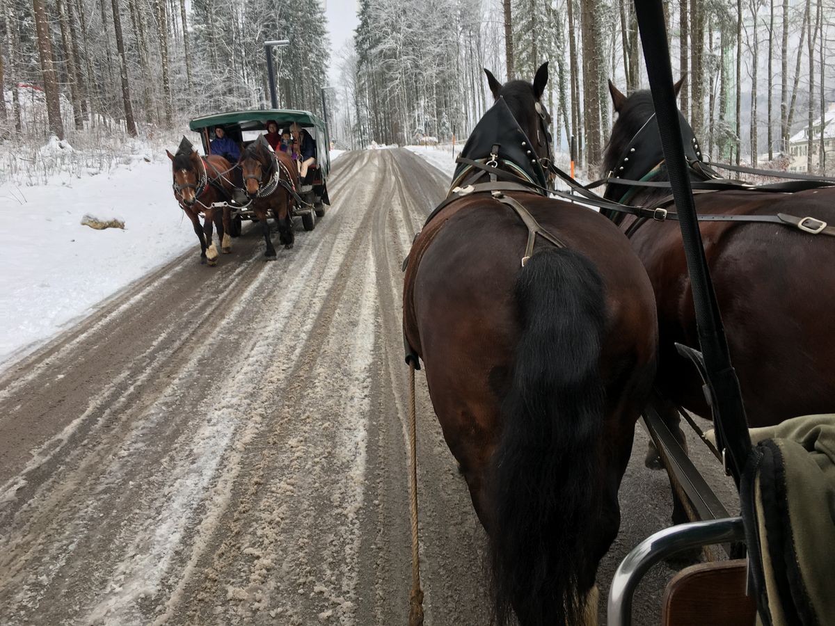 参加した時のメンバーは時間通り集合し、久しぶりに時間通りに集合できたと話されたガイドさん。バスの移動中ではルードヴィヒII世のことなど歴史的背景を詳しく説明してくださいました。わたしはそのような背景など全く調べてもなく、元々詳しいわけでもありませんでしたので、予備知識があるだけで見て回る時の面白さは違いました。割と長かったので寝てしまった方もいたかもしれませんが、なかなか面白かったですよ。お城までは各自登るので注意事項やオススメのお店を教えてくださいました。冬季ですので路面の雪が溶けていないためバスが出ておらず、マリエン橋も行けませんでしたが、自分は楽しめました。馬車は出ていますが、乗るまでに待ちますし、乗れても満員になるまで待つので時間が読めませんからご注意ください。解散してからすぐ並べば乗れるでしょうが、ホーエンシュバンガウ城などを先に見る場合(中には入れません)はまず乗れないでしょう。足腰に自信がない方はゆっくり登るしかないですね…歩きの路面は特に凍っておらず、歩きにくさはありませんでしたが、ヒールで来ている方がいて驚きました。さすがに歩きやすい靴の方がいいと思います。馬糞も落ちてますし(それは避ければいいですが)、若干泥で汚れます。キャリーケースやベビーカーを持っている方、車椅子の方は結構急な坂なので大変そうでした。