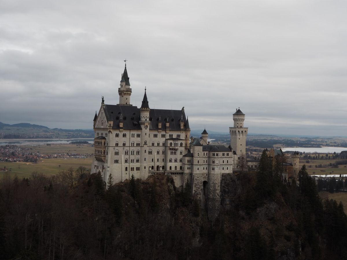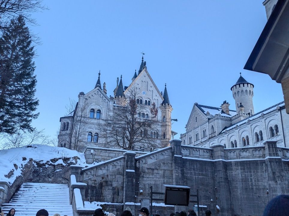 到着してからしばらくはまさに冬空といった感じでした。日本でも新潟などにスキーに行った時の曇り空を想像していただくとわかりやすいかとは思います。麓からノイシュヴァンシュタイン城へのバスは冬場など、道路事情によっては運行しておらず、今回も路面の凍結のため運行していませんでした。ですが、舗装された道路を30分弱歩いていけば辿り着くことができるので、行けないということはありませんでした。あまり食べ物を買える場所がないため、ノイシュヴァンシュタイン城に向かう際には、事前にミュンヘンなどで食料を買っておくことをお勧めします。
