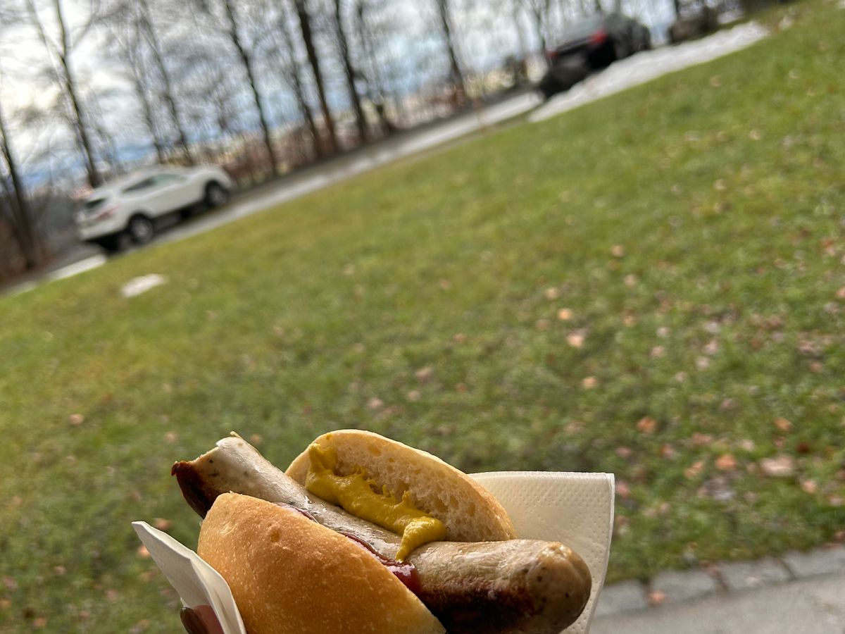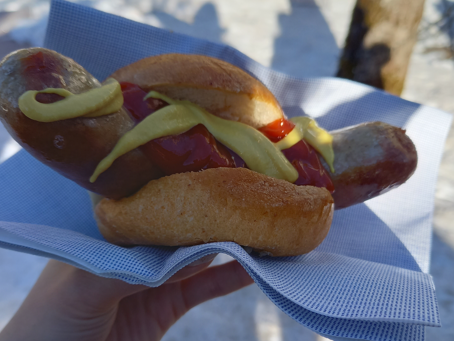 お城に行く途中にゴルフボール位のサイズのドーナツが売っており、揚げたてでフワフワしていて美味しいです。また、駐車場近くにホットドッグが売っていますが、大きなソーセージが挟まれていてとても美味しくお腹一杯になりました。