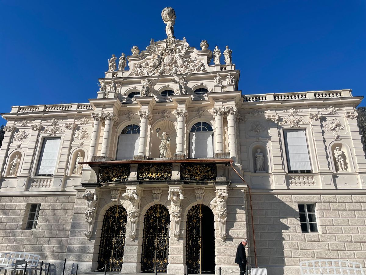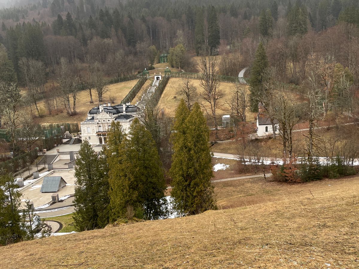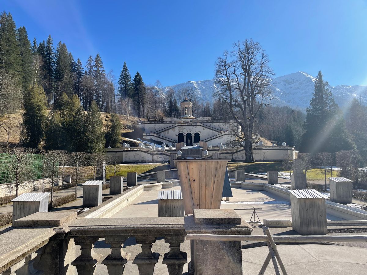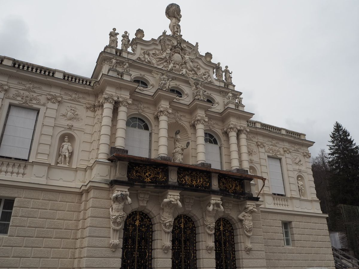 リンダーホーフ城の庭の彫刻は、雪から守るために木の箱で覆われていて見られず、その点が少し残念でした。