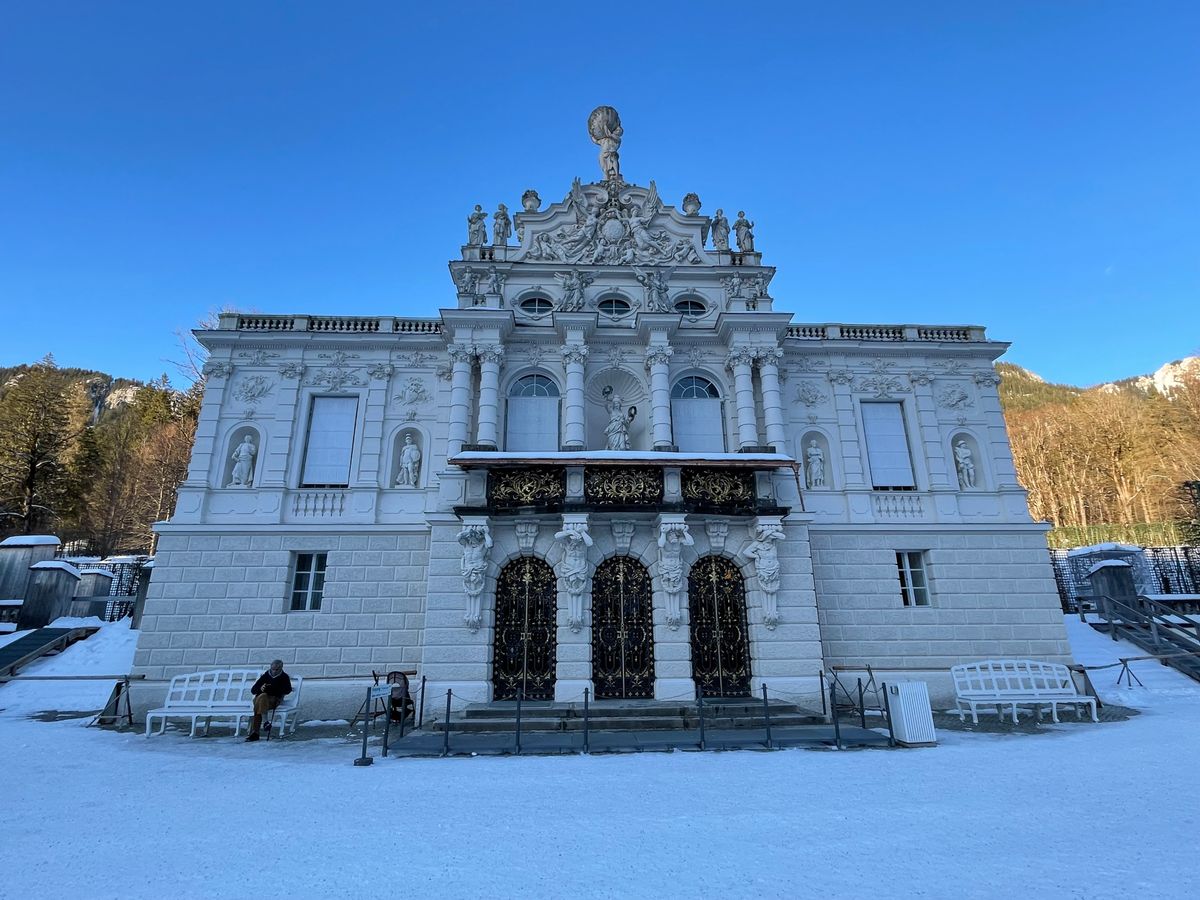 ノイシュバンシュタイン城の予約時間で周り順が変更になるそうで、まず初めにヴィース教会、運良く信者の方や他の見学客が居らず、存分に見学することができました。ノイシュバンシュタイン城の内部見学は新しい城なのでアトラクション感が否めませんが、雪を被った姿は素敵でした。マリエン橋から城を眺めた姿が美しいと聞きますが橋の通行止めでした。リンダーホフ城は庭の塑像や噴水が雪対策で見られなかったのが残念です。