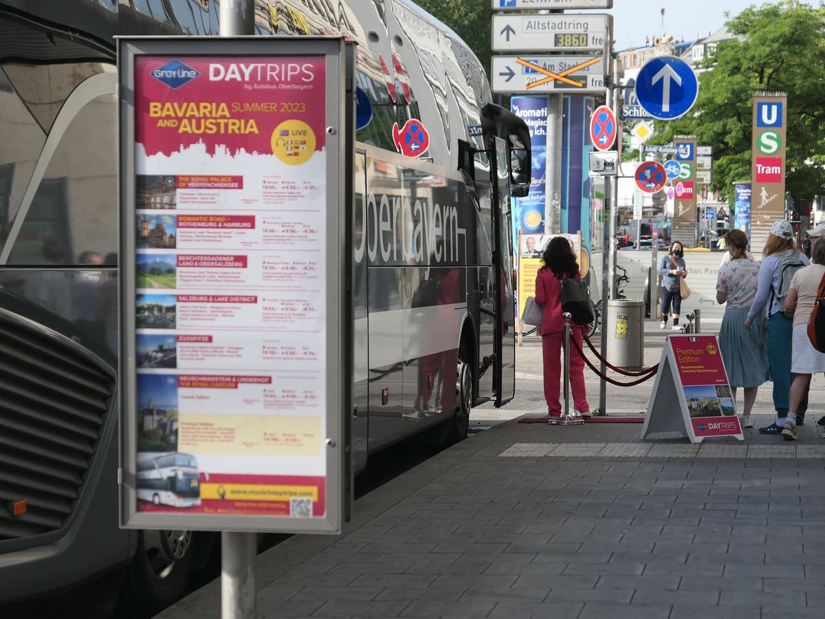 12月に一人旅で利用しました。まずバスにGrayLineSIGHTseeingと記載があると行き先の補足説明に書いてありますが、そのような文字はバスには書いてありませんでした。私は「AutobusOberbavern」と書いてある二階建てのバスでした。バスの行き先が流れるテロップのところもMerry Christmasと流れてるだけで、ツアーの情報は流れてなかったので、バスガイドさんに聞いて確かめるのが良いと思います。