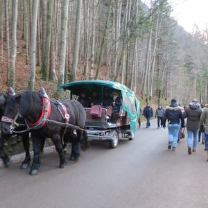 ノイシュバンシュタイン城は雪でシャトルバスが運行しておらず、行きは馬車で行きました。徒歩で行った方もいました。ガイドさんは、近くに湖があると教えてくれたり、このお店はこういうものが食べられるなど、とても細やかに面倒を見てくれました。馬車を降りてすぐの坂のところに揚げドーナツを売っているお店があってあつあつモチふわで美味しかったです。