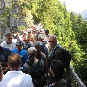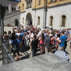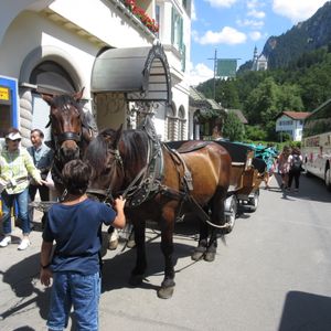 ノイシュバンシュタイン城ではお城まで行くのに、徒歩・シャトルバス・馬車の3通りがあり、自分で決めて行くのですが、ハイシーズンの馬車は長蛇の列で、しかも15~20分に1台ぐらいしか来ないので、待ち時間を考えないと結局入場時間に間に合わないことになりかねません。徒歩が一番確実かとおもいました(徒歩だと30分弱ぐらい)。また、城内でも階段を上ったり下りたりとけっこう動きますので、トータルの運動量はかなりのものになります!ですが、すばらしいお城です!