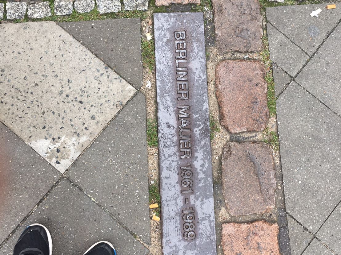 ベルリンの壁の歴史。壁がどこに存在していたのかそして、第二次世界大戦時、ナチスドイツ下で犠牲になったユダヤ人の方々のモニュメントが道路に刻まれている事なども教えてもらいました。