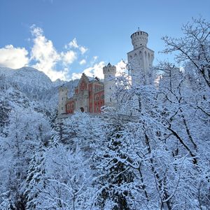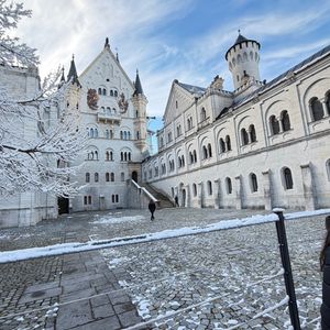 ノイシュバンシュタイン城**は、晴れた空の下、雪化粧と相まって、まるで絵画のような幻想的な美しさでした。