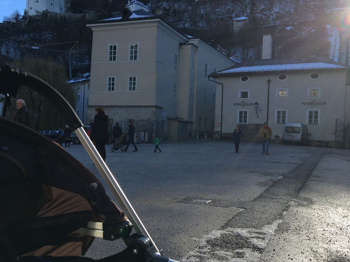 この日(12月中旬)は幸い天気に恵まれましたが、ザルツブルグはミュンヘン市内より寒く感じました。ベビーカーの息子にはスキーウェアを