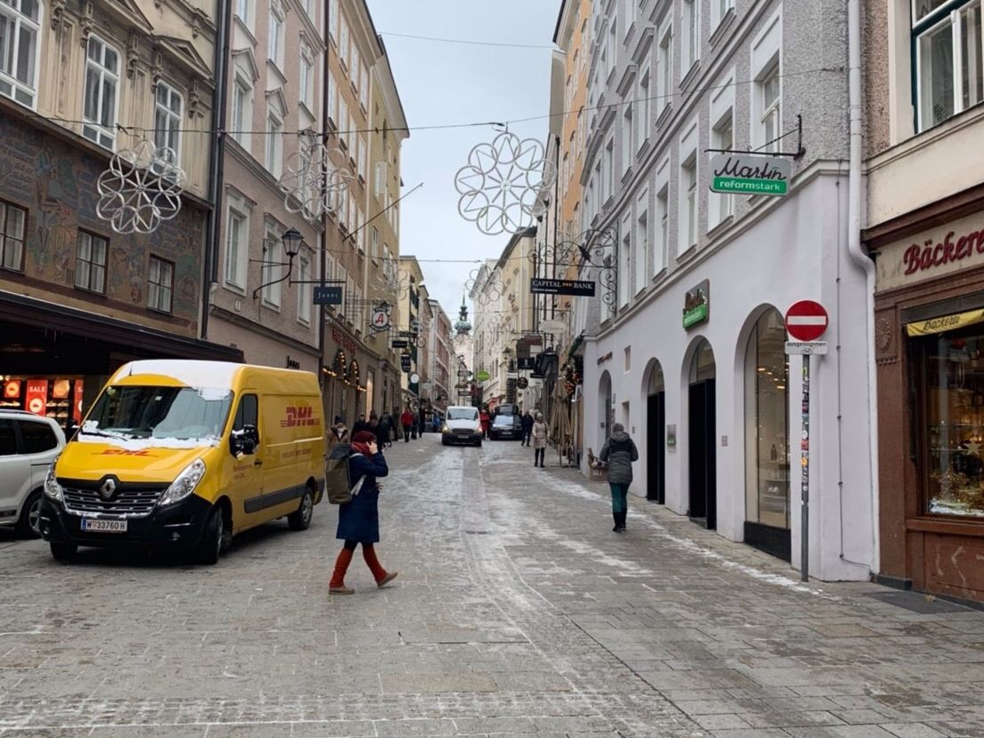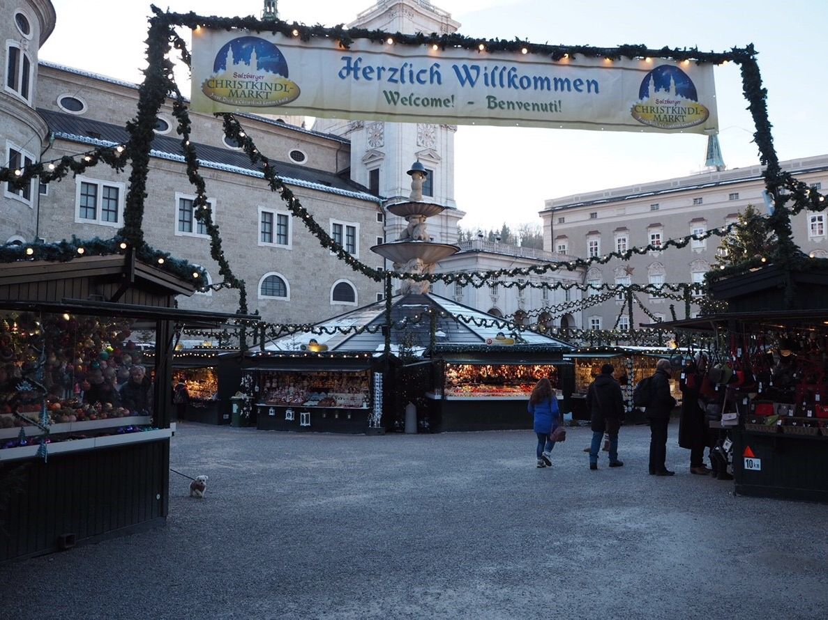 ザルツブルグに到着し、バスを降りてガイドさんから見どころを聞きつつ、みんなで街の中心地まで歩きました。そこから4時間ほどの自由時間がありました。私たちは観光案内所で地図を受け取り、クリスマスマーケットで昼食後、大聖堂を見学し、ホテルザッハーでザッハトルテを食べ、ミラベル庭園を見学しました。私たちはのんびり観光しましたが、モーツァルトの家などを見学する時間も十分にあると思います。なお、クリスマスマーケットに併設された仮設のお手洗いは暖房完備でとても清潔でした。