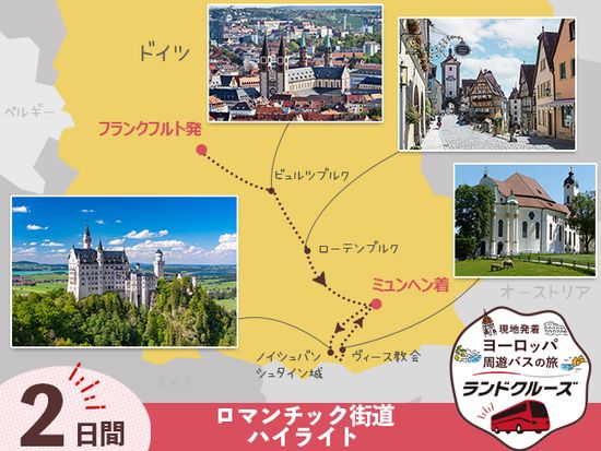 フランクフルト発ミュンヘン着 ロマンチック街道1泊2日 ローテンブルク+ミュンヘン+ノイシュバンシュタイン城+世界遺産ヴィース教会<土曜/1名催行/日本語>