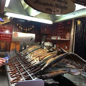 平日のツアーなので多少の渋滞はありましたが、概ね予定通りの時間でそれぞれ充分楽しめました。エスリンゲンでは中世の格好をして物を売っている市も併せて見られますが、クリスマスマーケット全体的にも時代が違う雰囲気があり良かった。教えていただいたドイツ最古ゼクトのお店(もともとフランスの有名シャンパンの会社にいた方がエスリンゲンで立ち上げたそうです)では飲む事も出来ますし、私は試飲して買ってきました。シュトットガルトは盛り盛り屋根が可愛い。マグもいろいろあってどれを持ち帰るか迷う!さすが車で有名な街の中という感じです。他では見た事がない鯖の炭焼き屋台で友達と分けて食べました(実は箸と小袋醤油を持参 笑)立派な屋内のマルクトハレの中も見られたし、車内では穏やかな語り口のガイドさんから様々な歴史をお聞きでき、楽しいツアーでした。